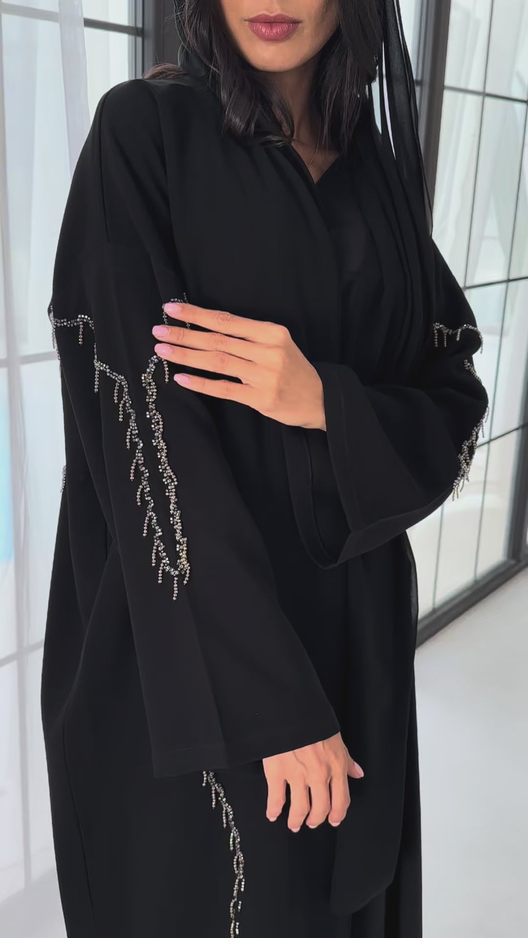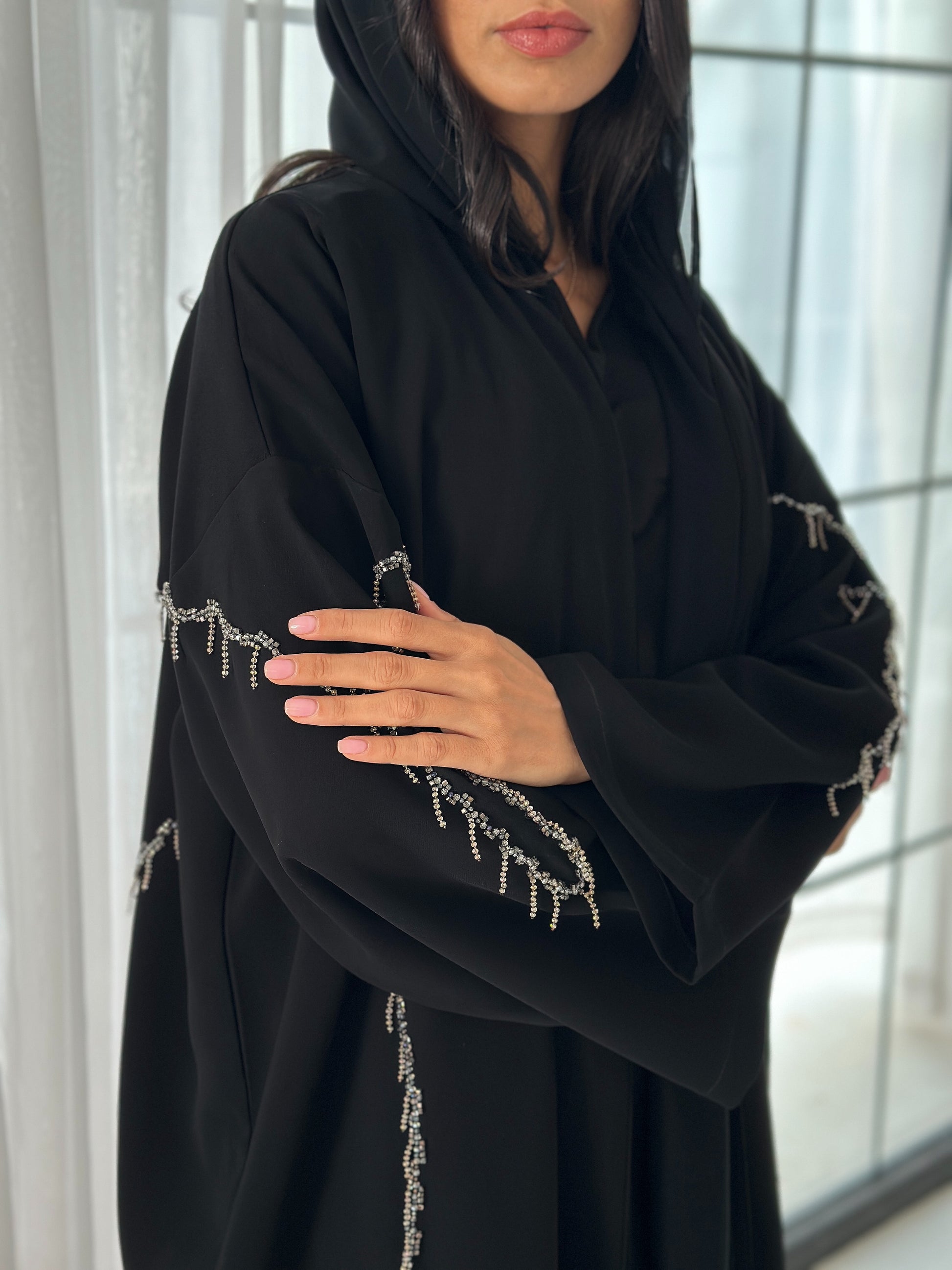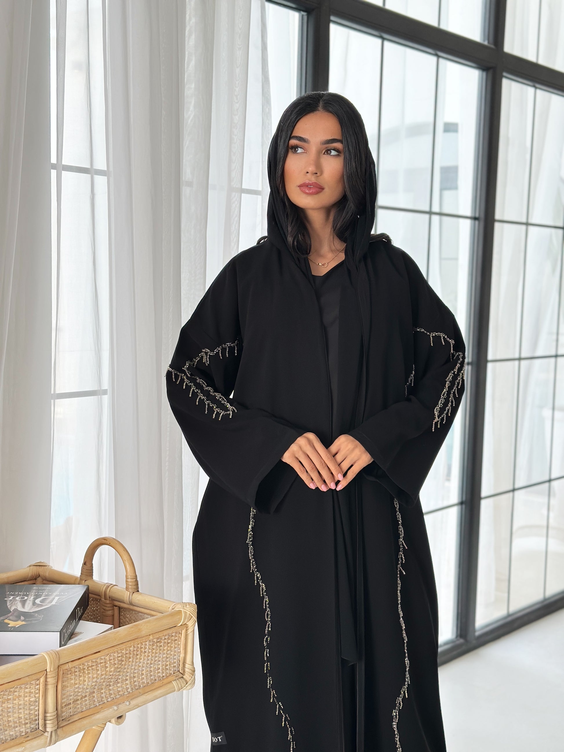 Open-front, hooded abaya detailed with cascading crystal fringe along the sleeves and front edges. Cut in lightweight Korean Nida with a fluid, matte drape; comfortable for Dubai & Abu Dhabi. Matching shayla included.