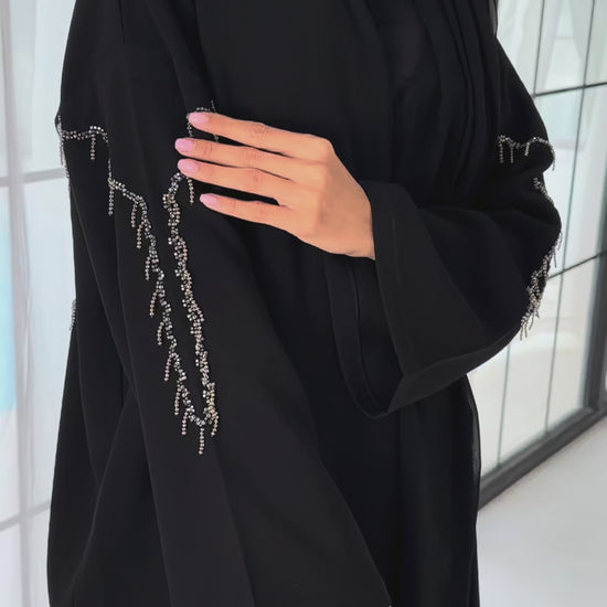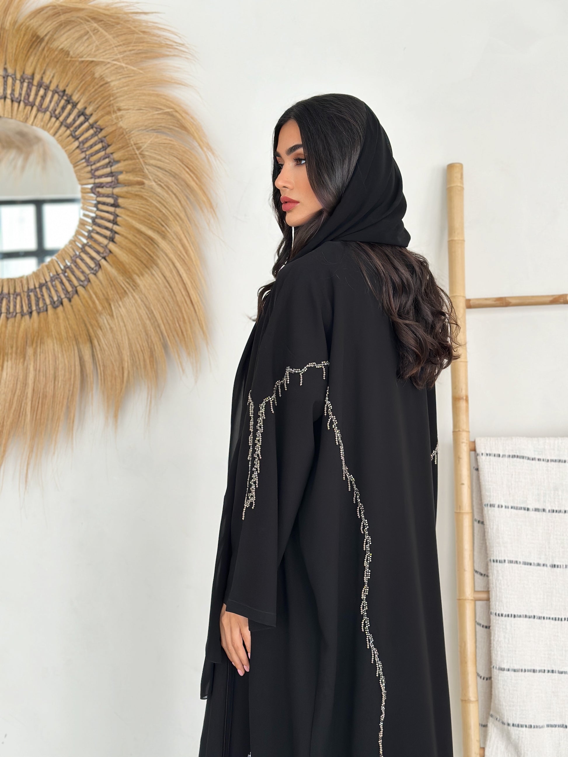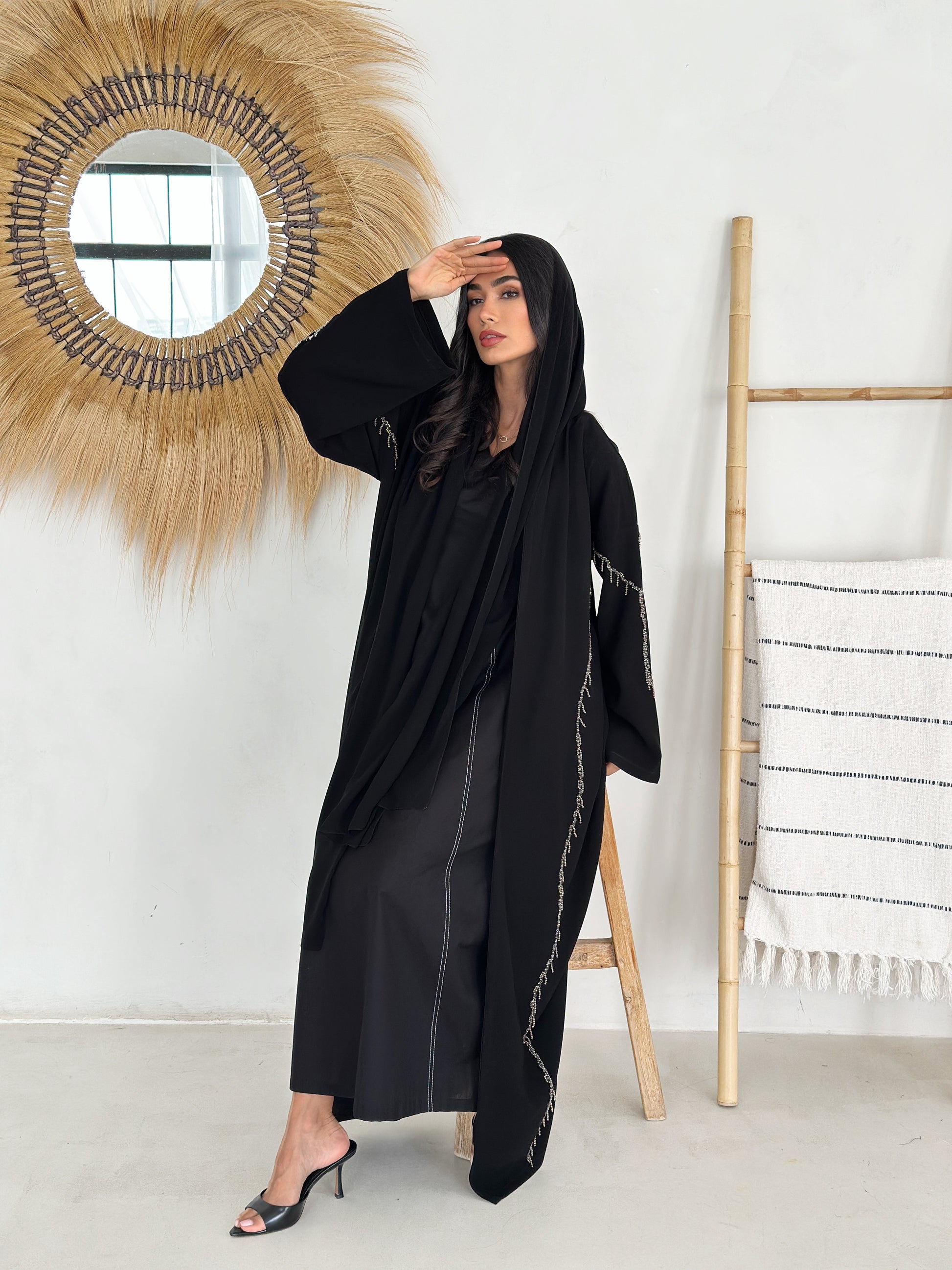 Open-front, hooded abaya detailed with cascading crystal fringe along the sleeves and front edges. Cut in lightweight Korean Nida with a fluid, matte drape; comfortable for Dubai & Abu Dhabi. Matching shayla included.