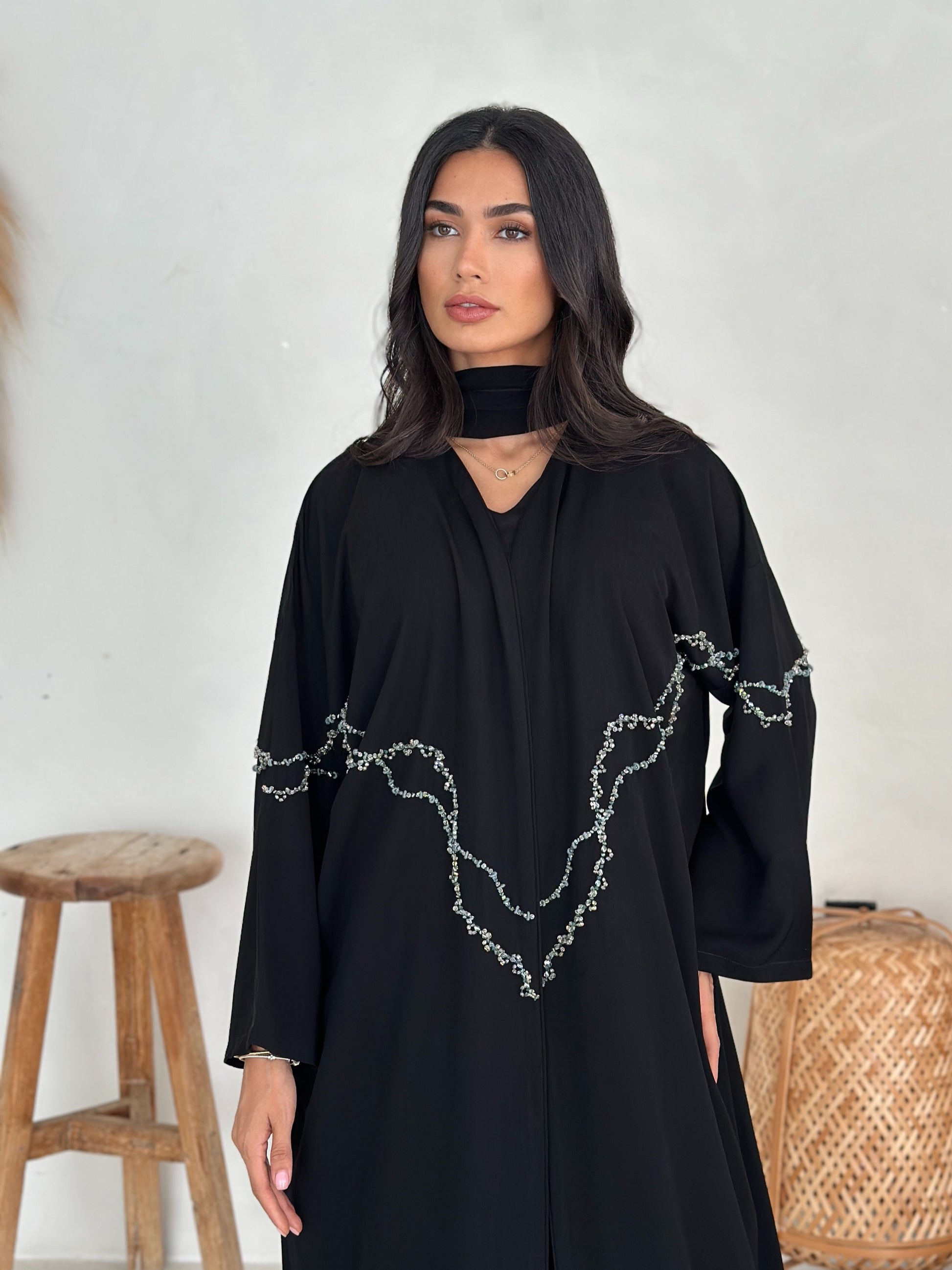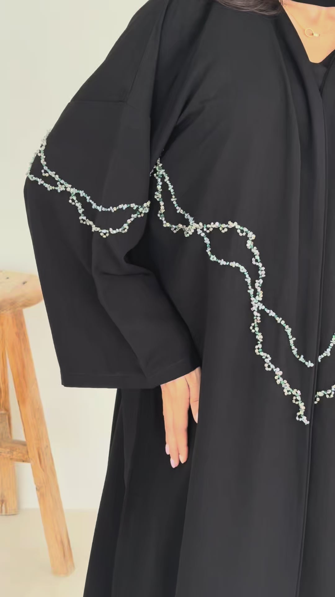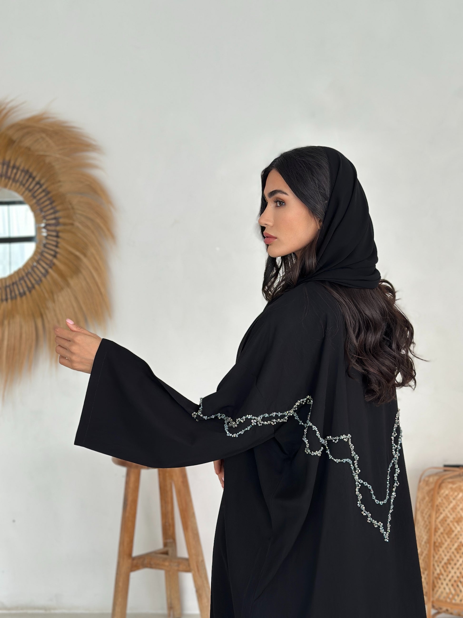 Open-front abaya featuring a delicate beaded vine motif that forms a soft V-yoke across the front and wraps the sleeves. Cut in lightweight Korean Nida with a smooth, fluid drape comfortable for Dubai & Abu Dhabi day-to-night wear. Matching shayla included.
