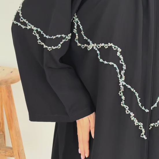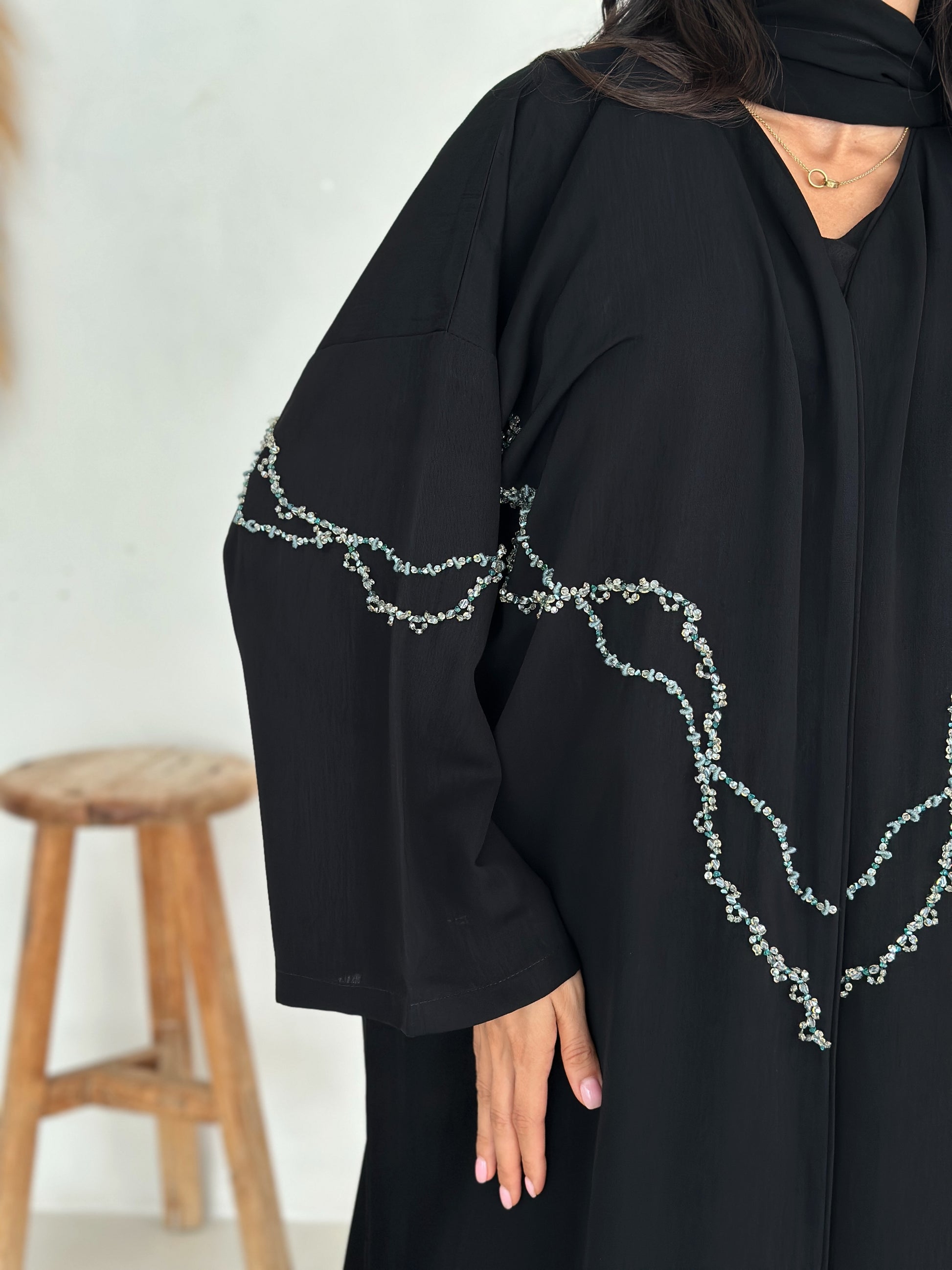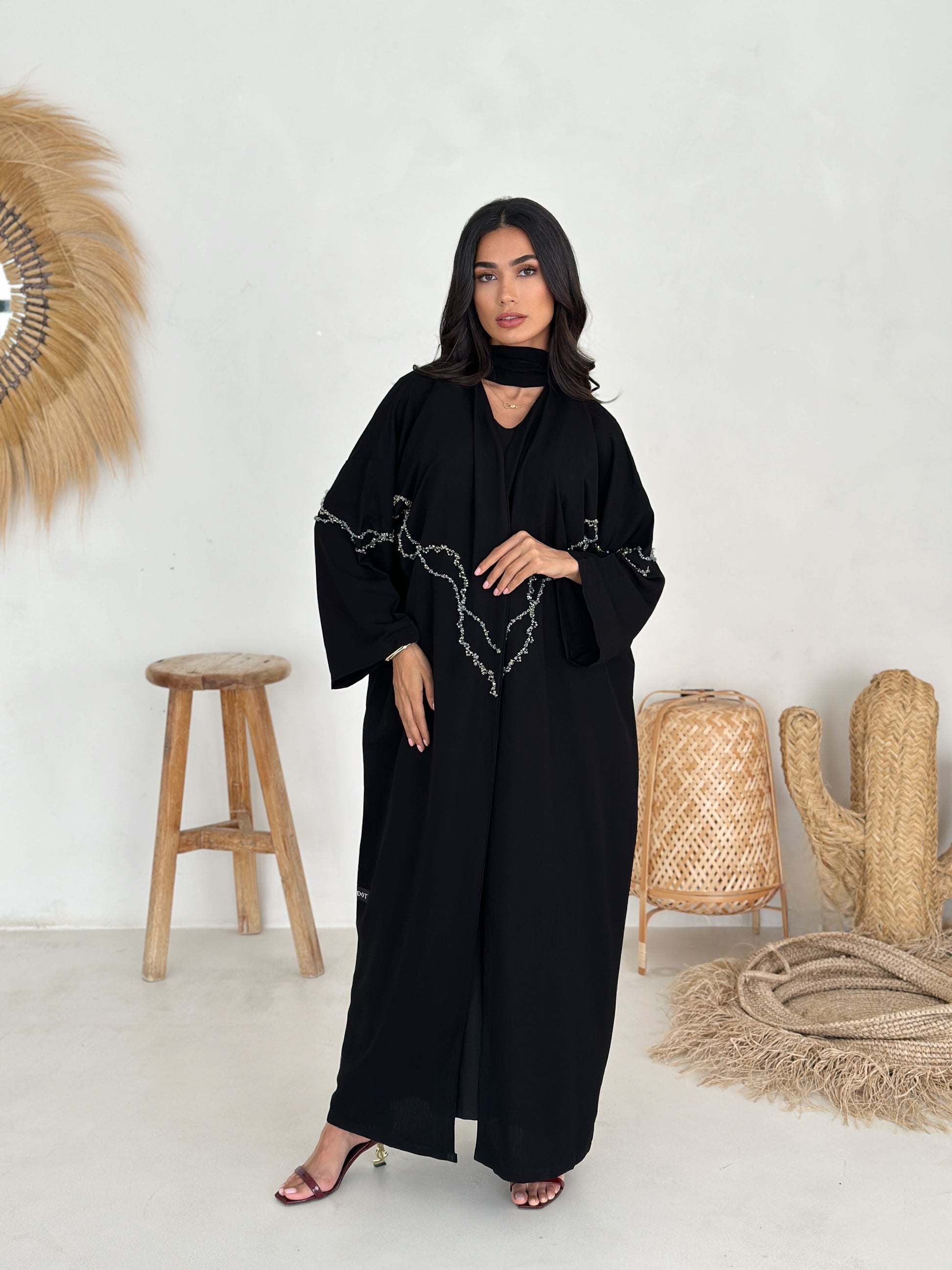 Open-front abaya featuring a delicate beaded vine motif that forms a soft V-yoke across the front and wraps the sleeves. Cut in lightweight Korean Nida with a smooth, fluid drape comfortable for Dubai & Abu Dhabi day-to-night wear. Matching shayla included.