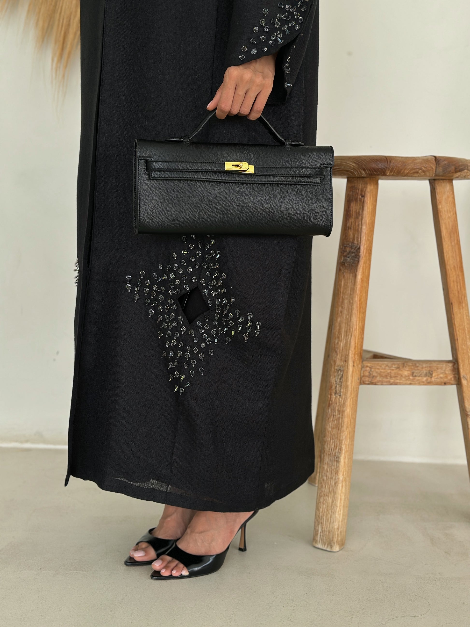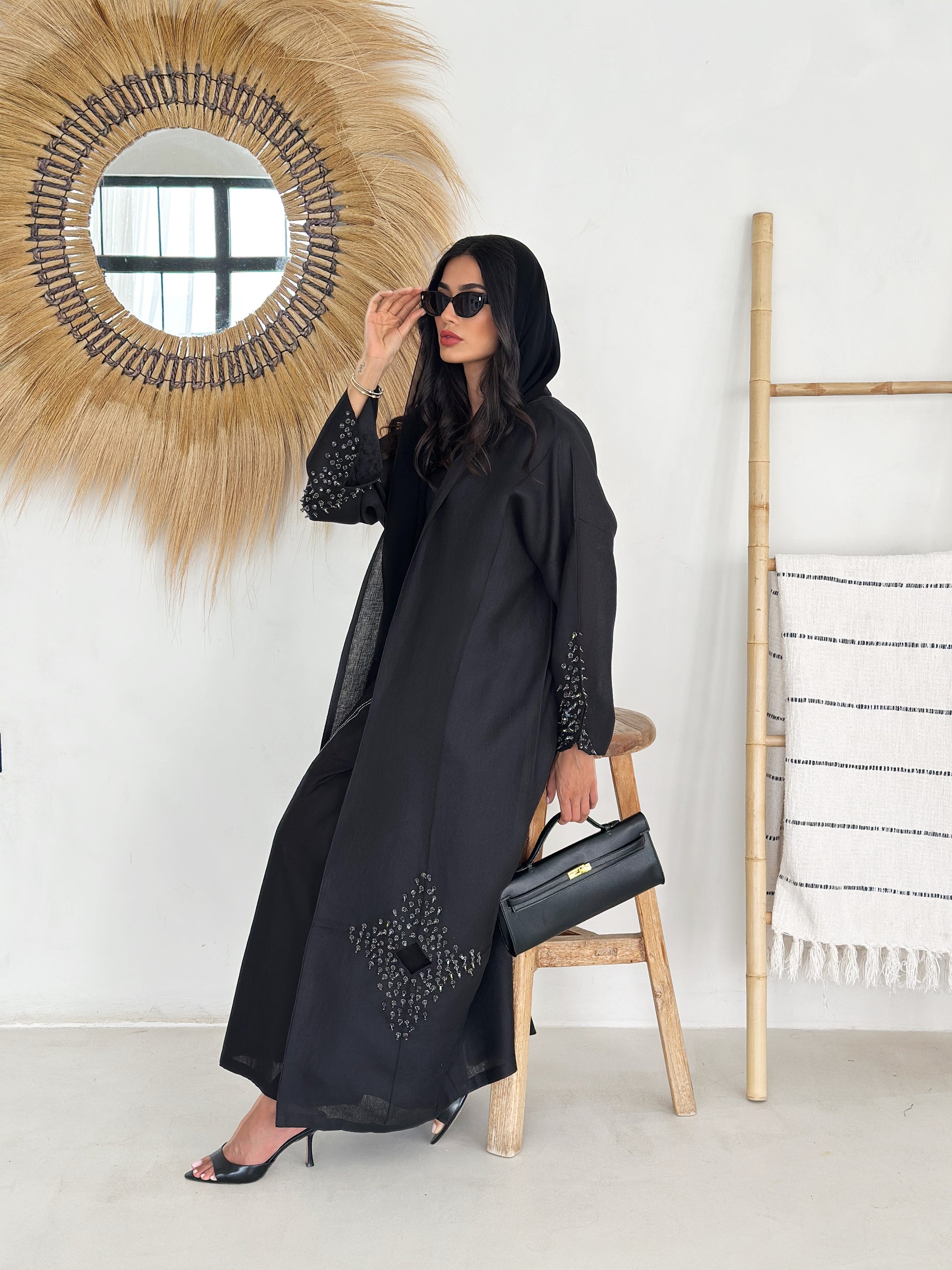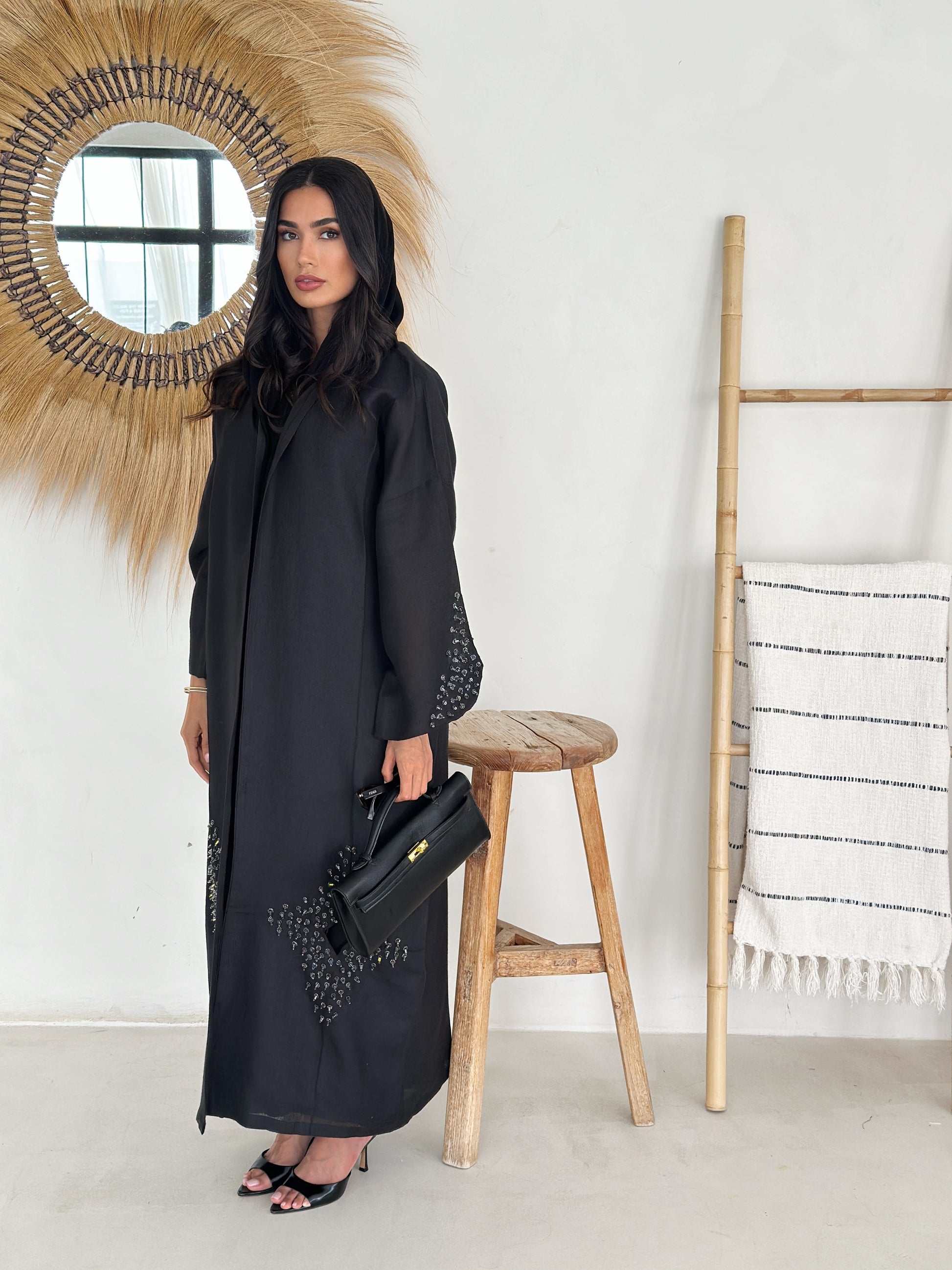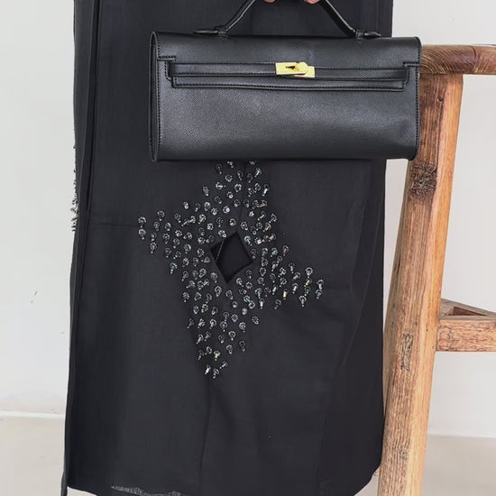 Open-front abaya with statement diamond panels at the front hem and beaded cluster detailing on wide sleeves. Relaxed, flowing silhouette in lightweight textured crepe easy, breathable wear for Dubai & Abu Dhabi. Matching shayla included.