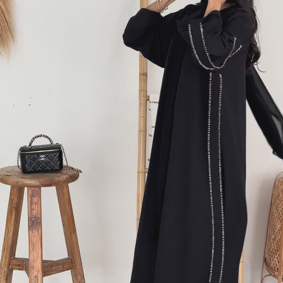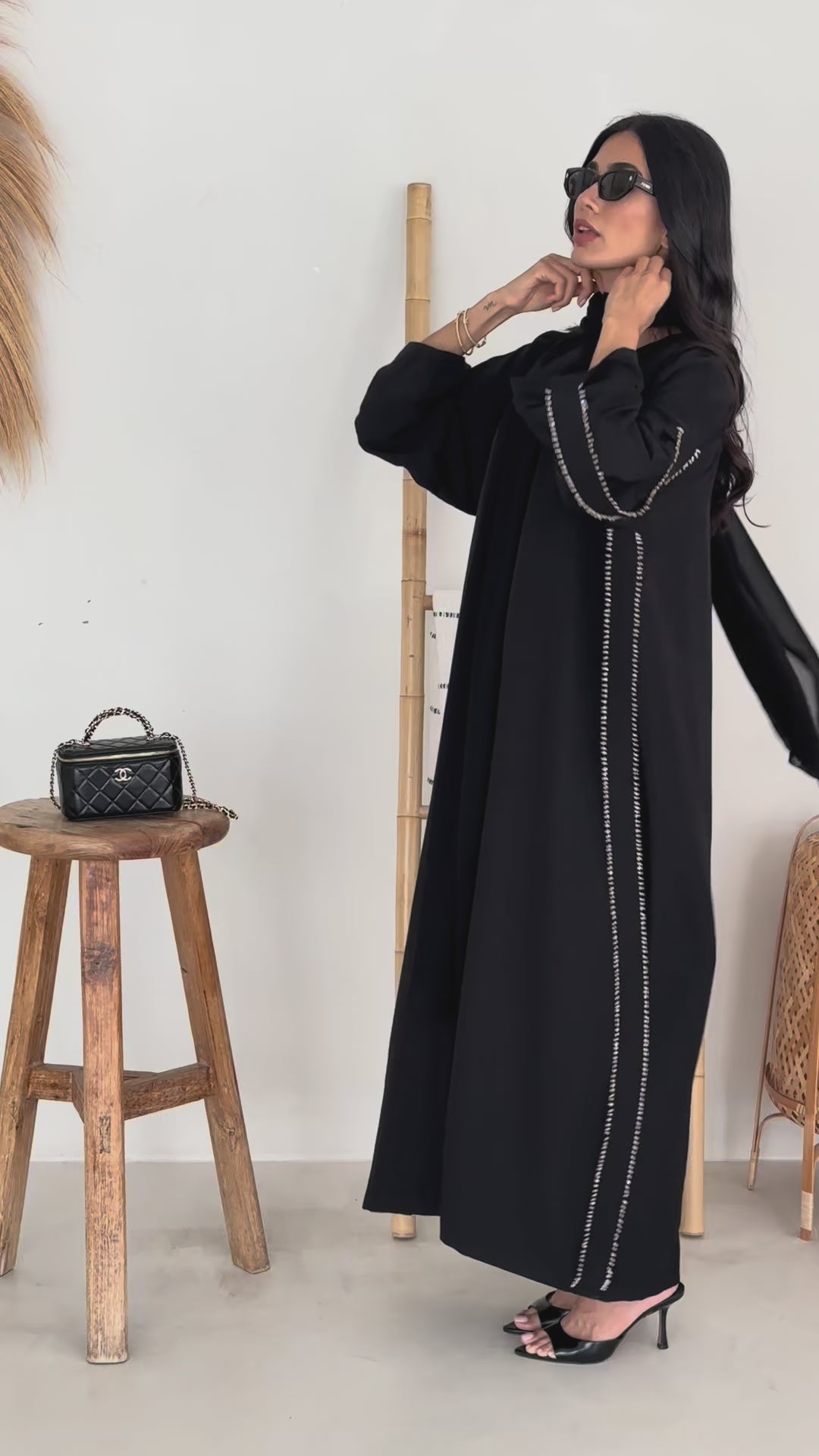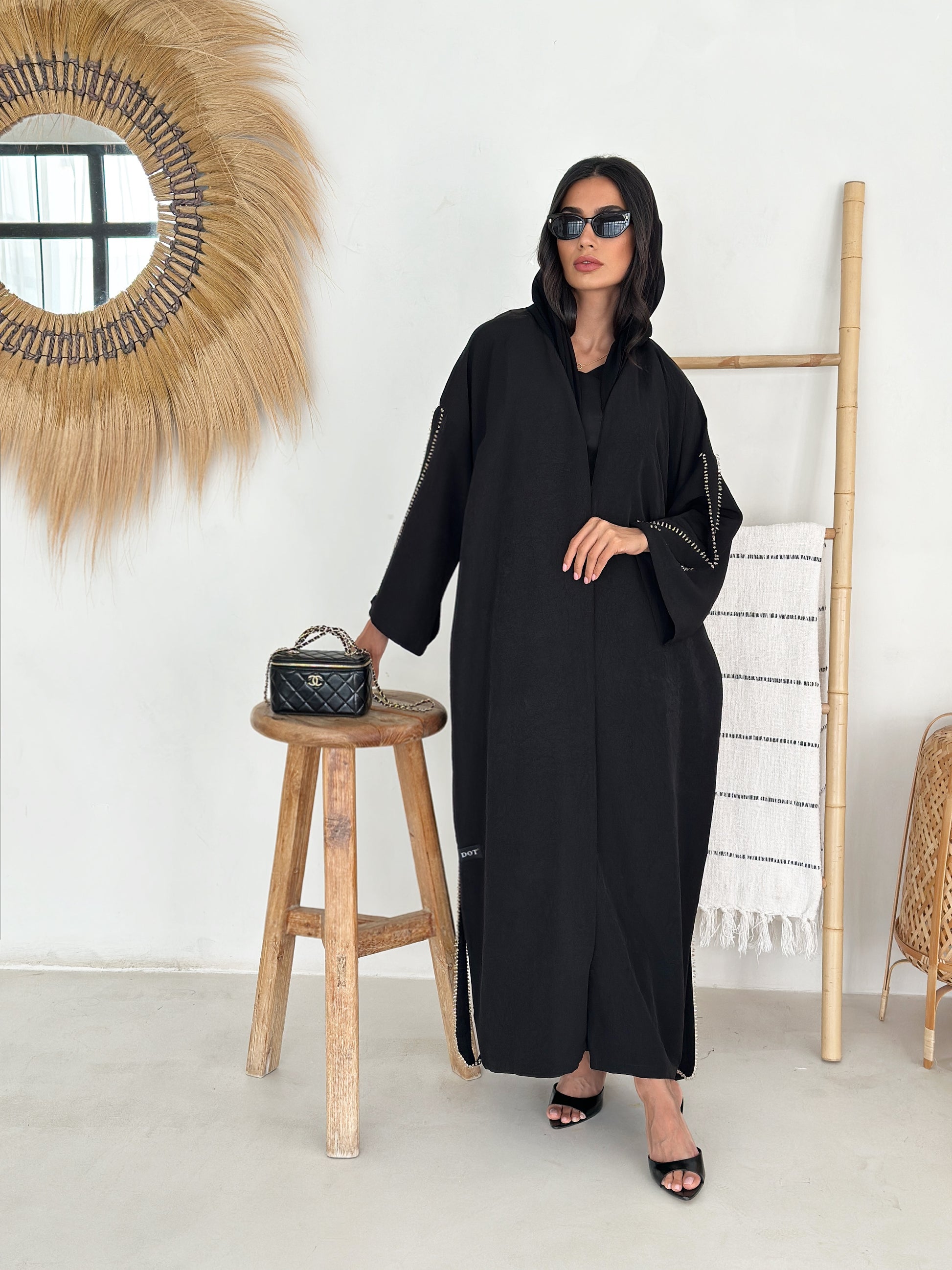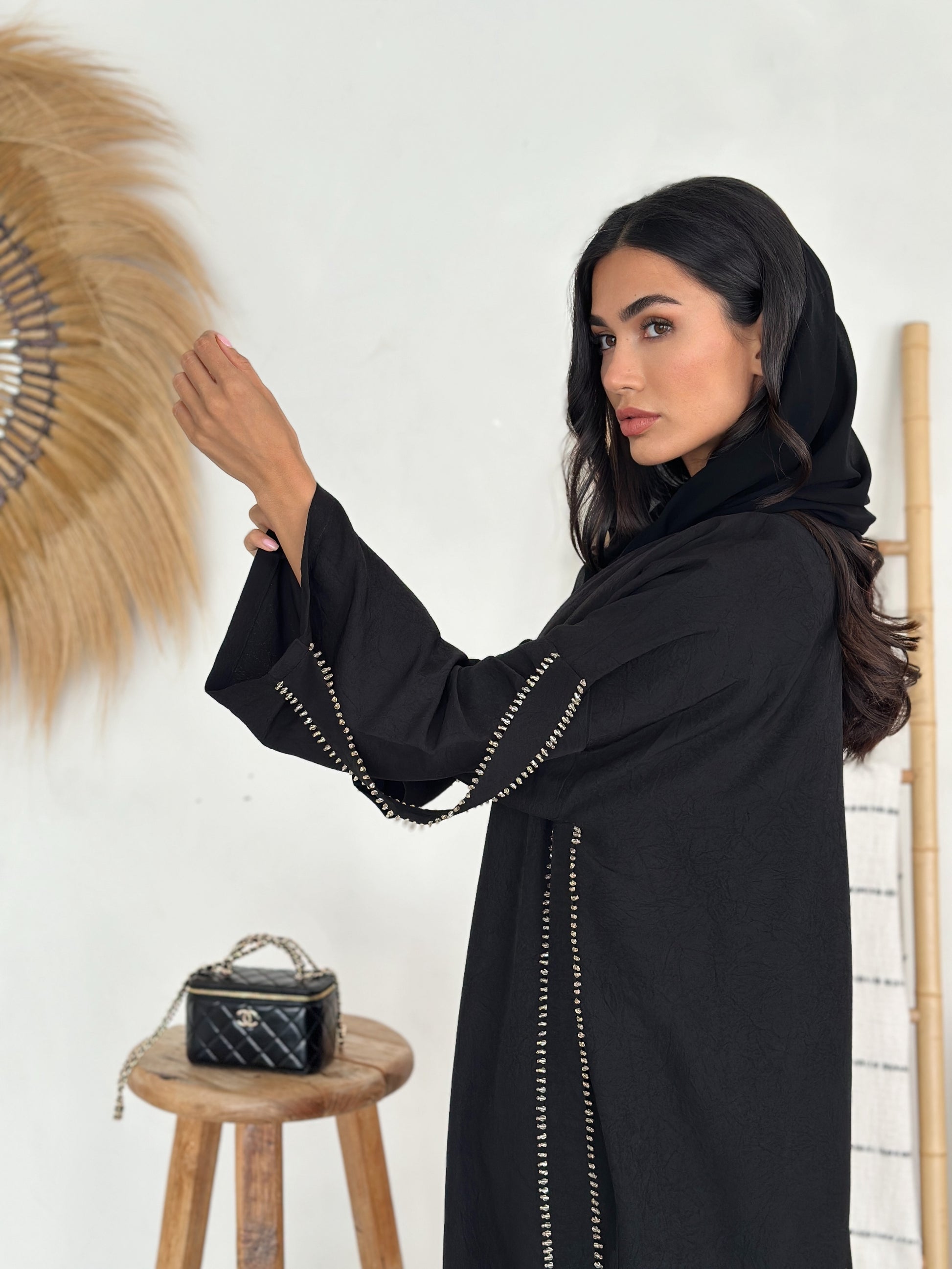 Open-front, hooded abaya framed with continuous metallic stud beading along the front edges and sleeves, finishing in chic tassel drops. Relaxed silhouette in lightweight textured crepe for easy movement and breathable comfort in Dubai & Abu Dhabi. Matching shayla included.