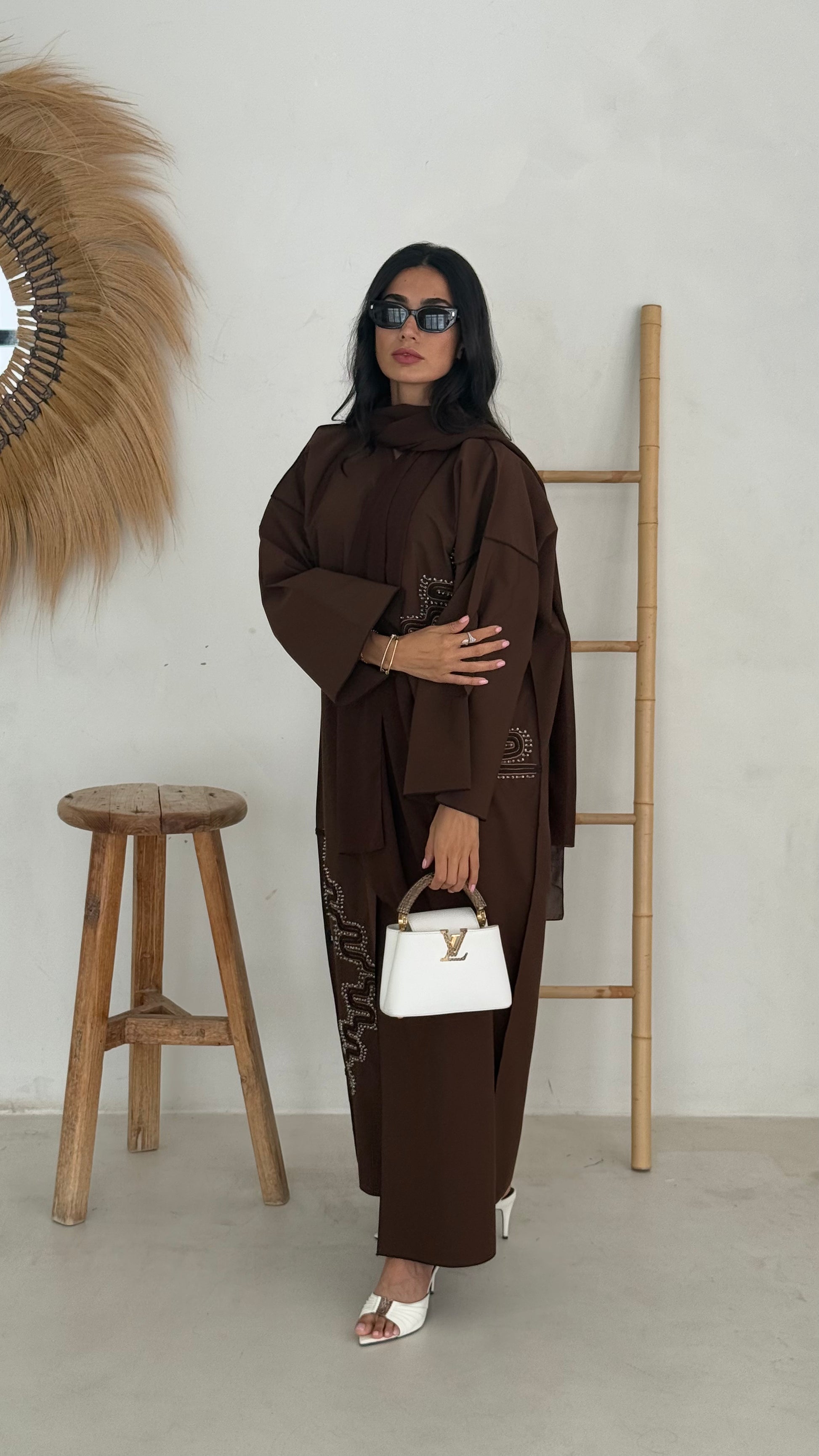 Open-front abaya in rich mocha with serpentine beadwork tracing both side panels for elongating lines. Relaxed silhouette in lightweight Korean Nida with a smooth drape easy, breathable wear for Dubai & Abu Dhabi. Matching shayla included.
