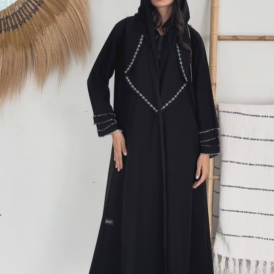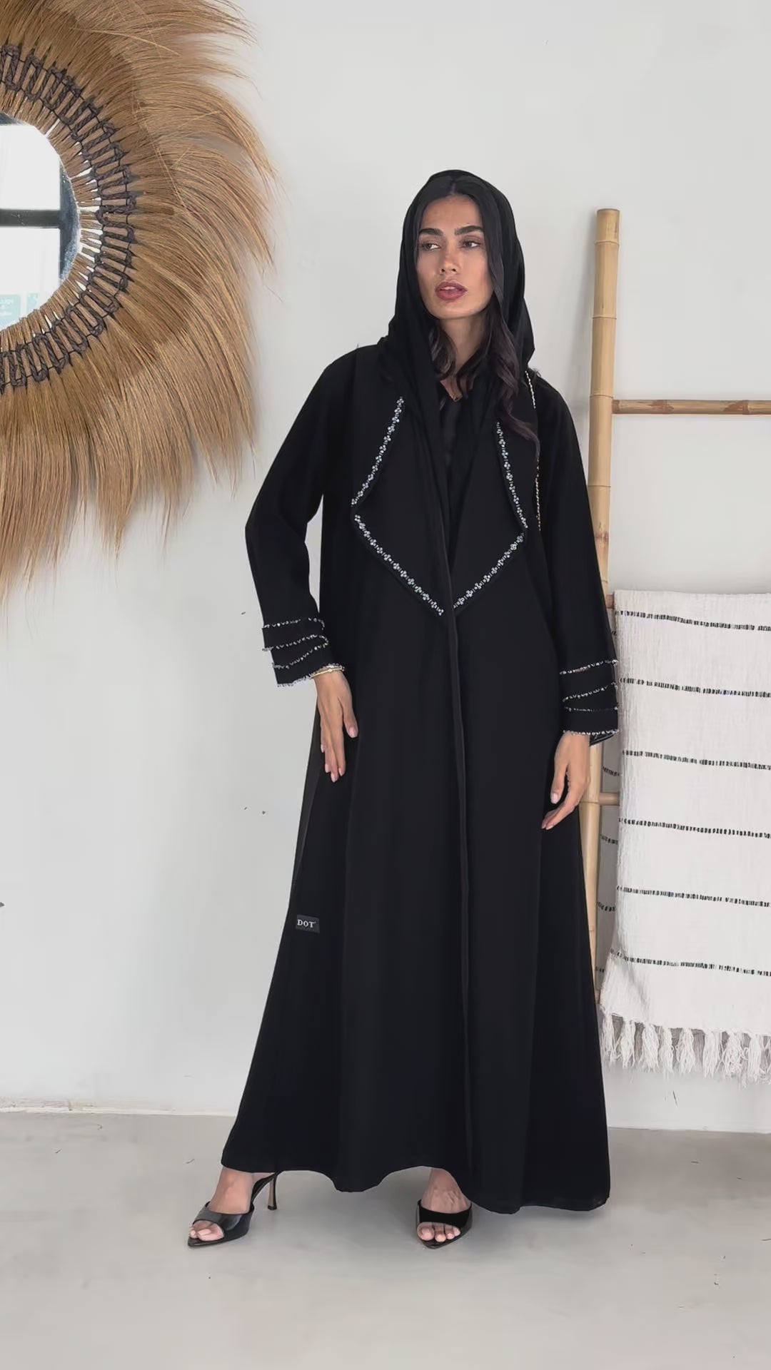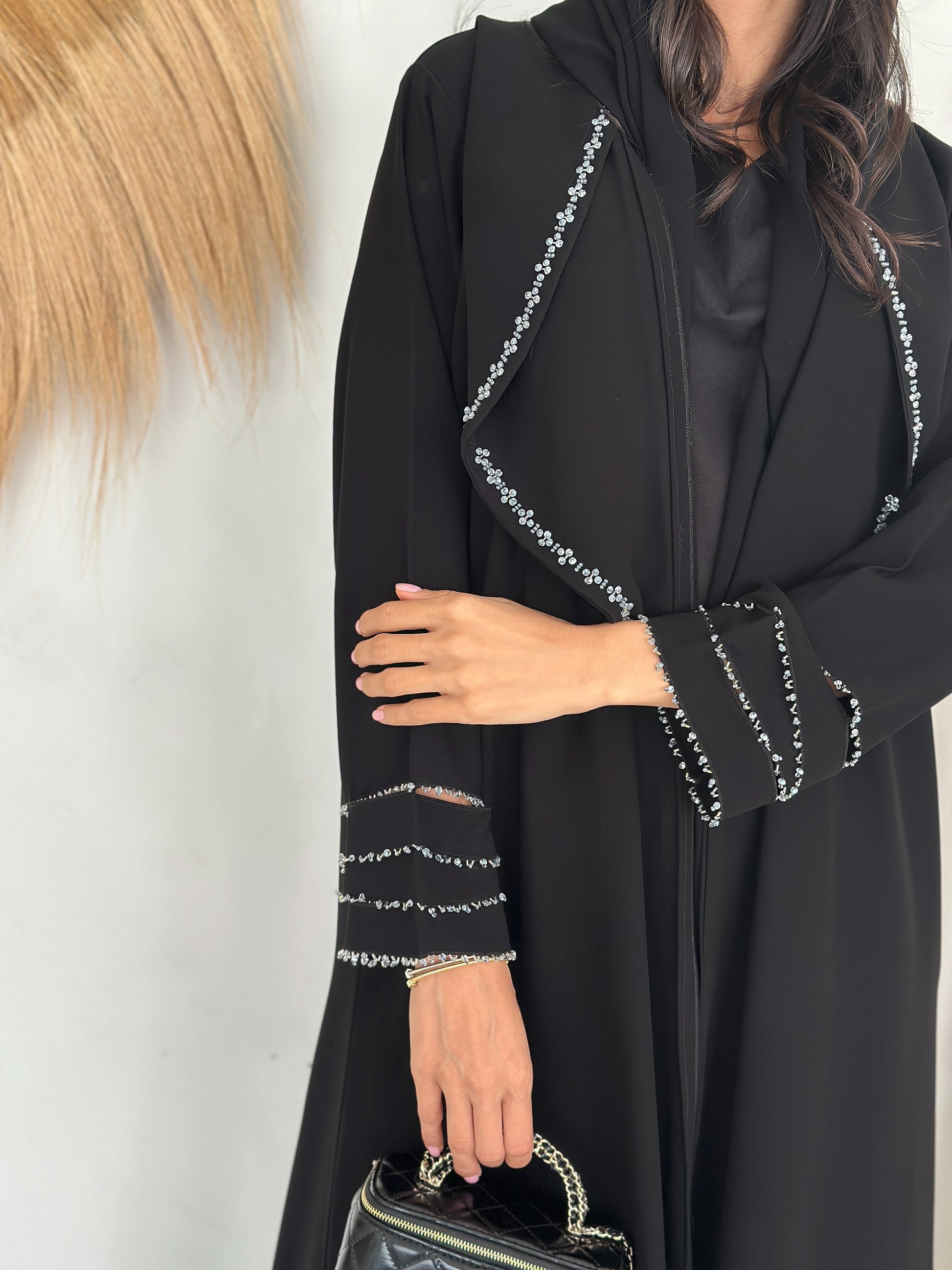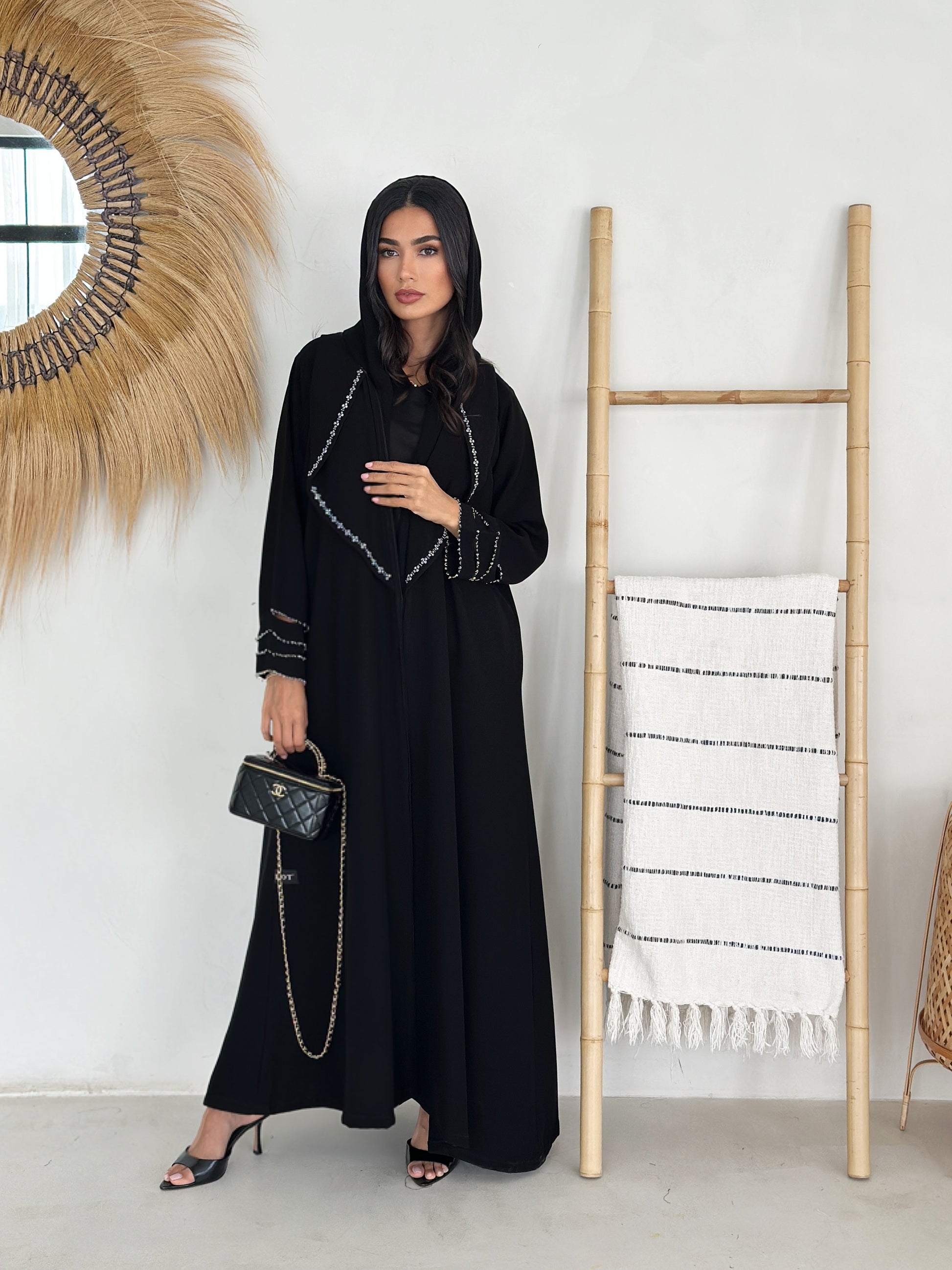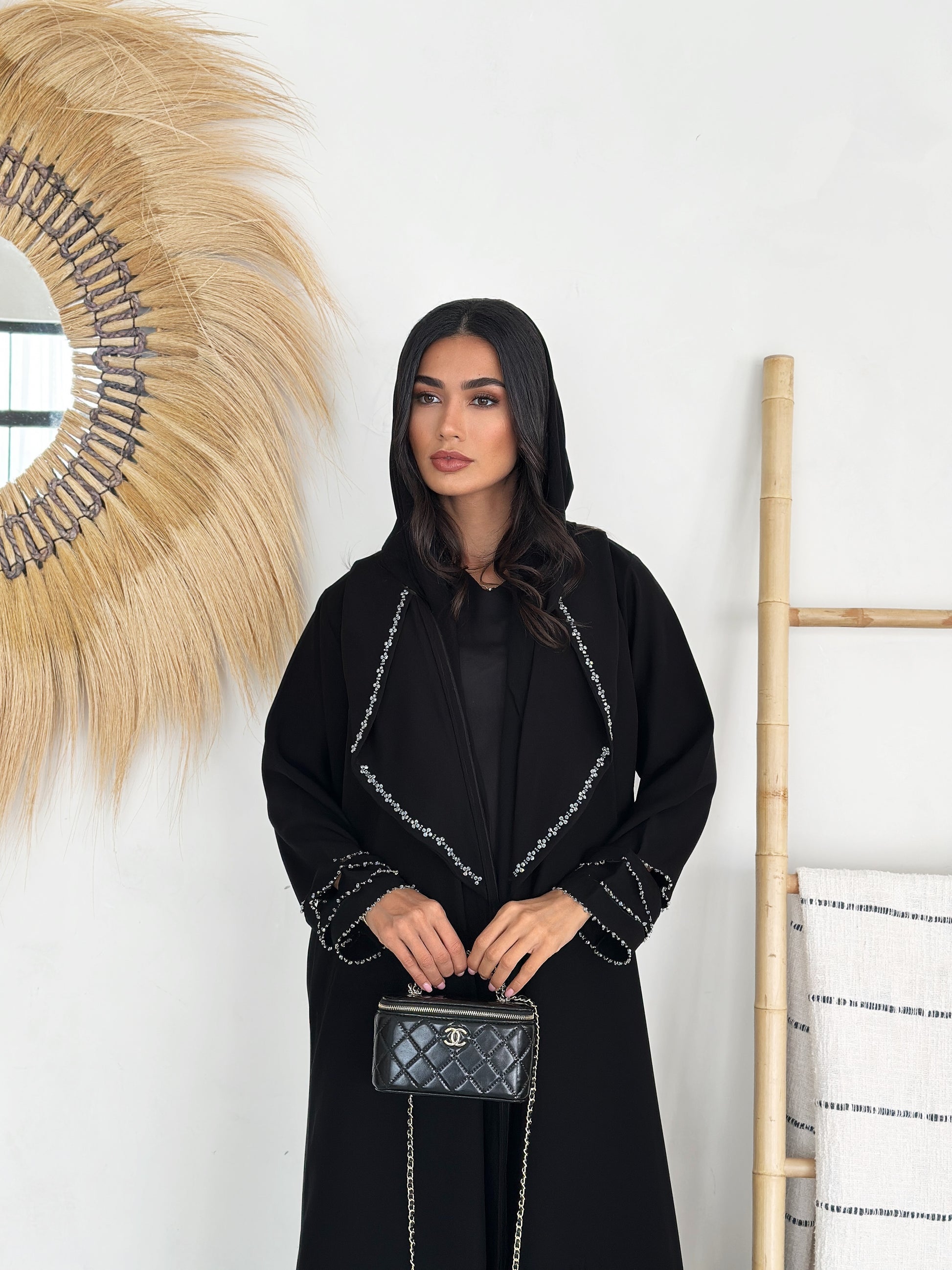 A refined, open-front abaya featuring a softly draped hood and hand-placed crystal trim along the lapels and triple sleeve bands. Tailored in breathable Korean Nida with a fluid, matte finish ideal for Dubai and Abu Dhabi day-to-night wear. Includes matching shayla; easy-care and travel friendly.
