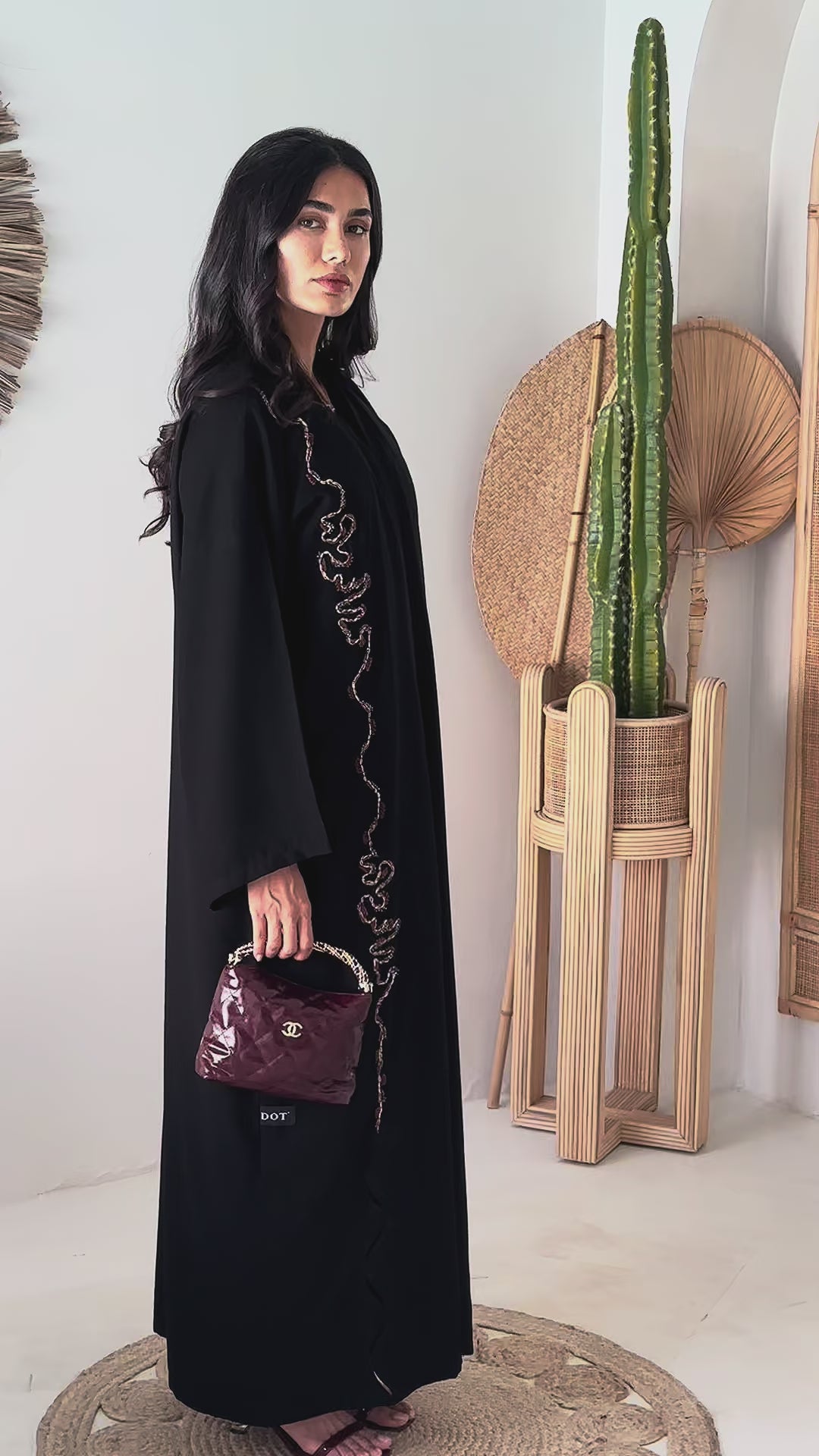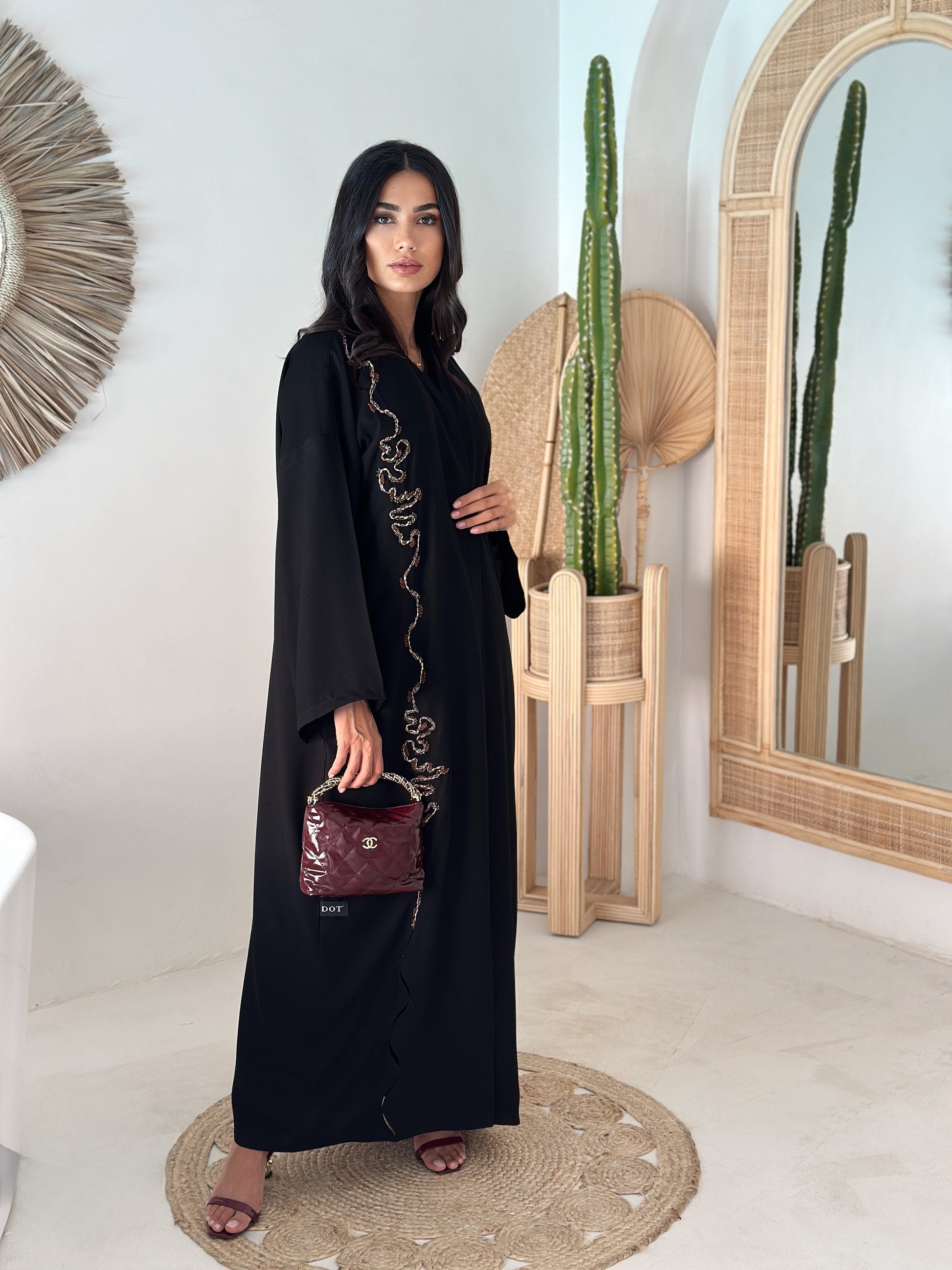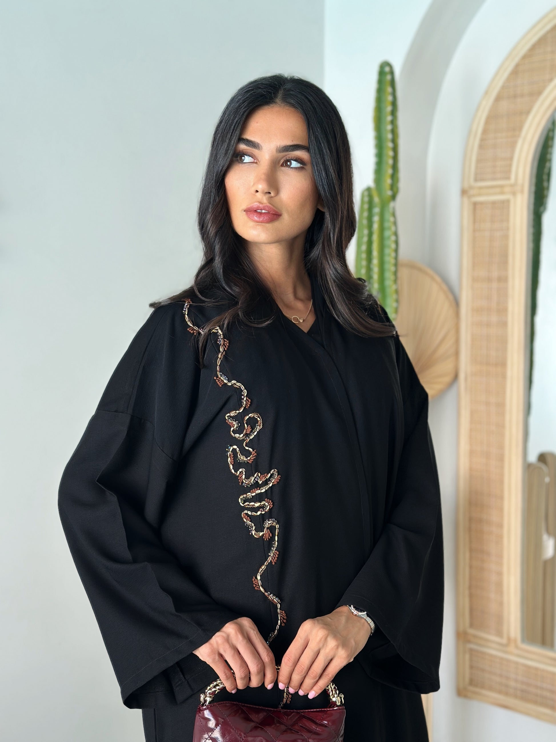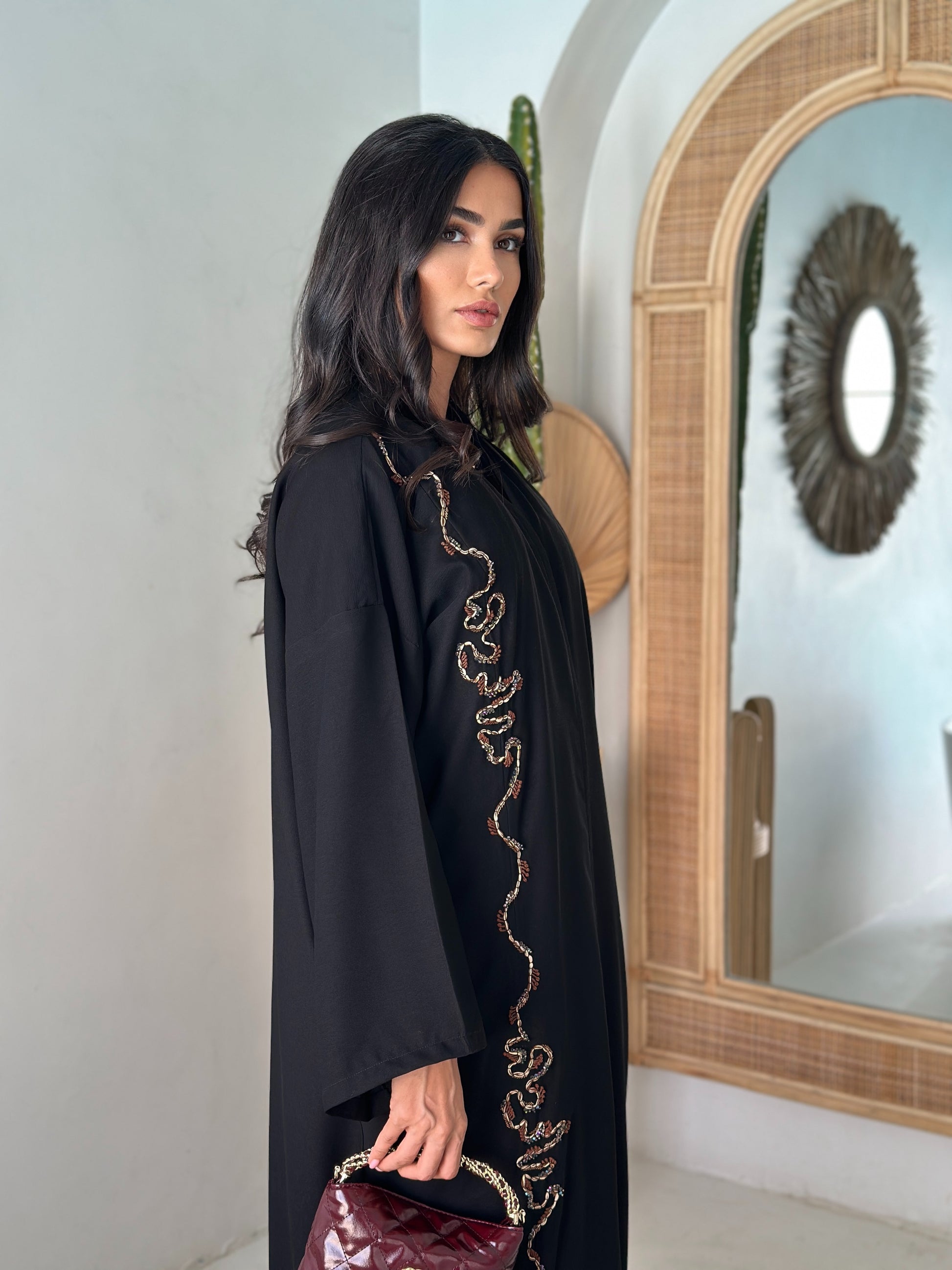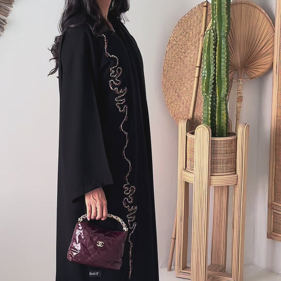 Open-front abaya with an asymmetric, hand-beaded serpentine trim running from shoulder to hem in warm gold and garnet tones. Relaxed sleeves for easy movement; lightweight Korean Nida with a fluid, matte drape comfortable for Dubai & Abu Dhabi. Matching shayla included.